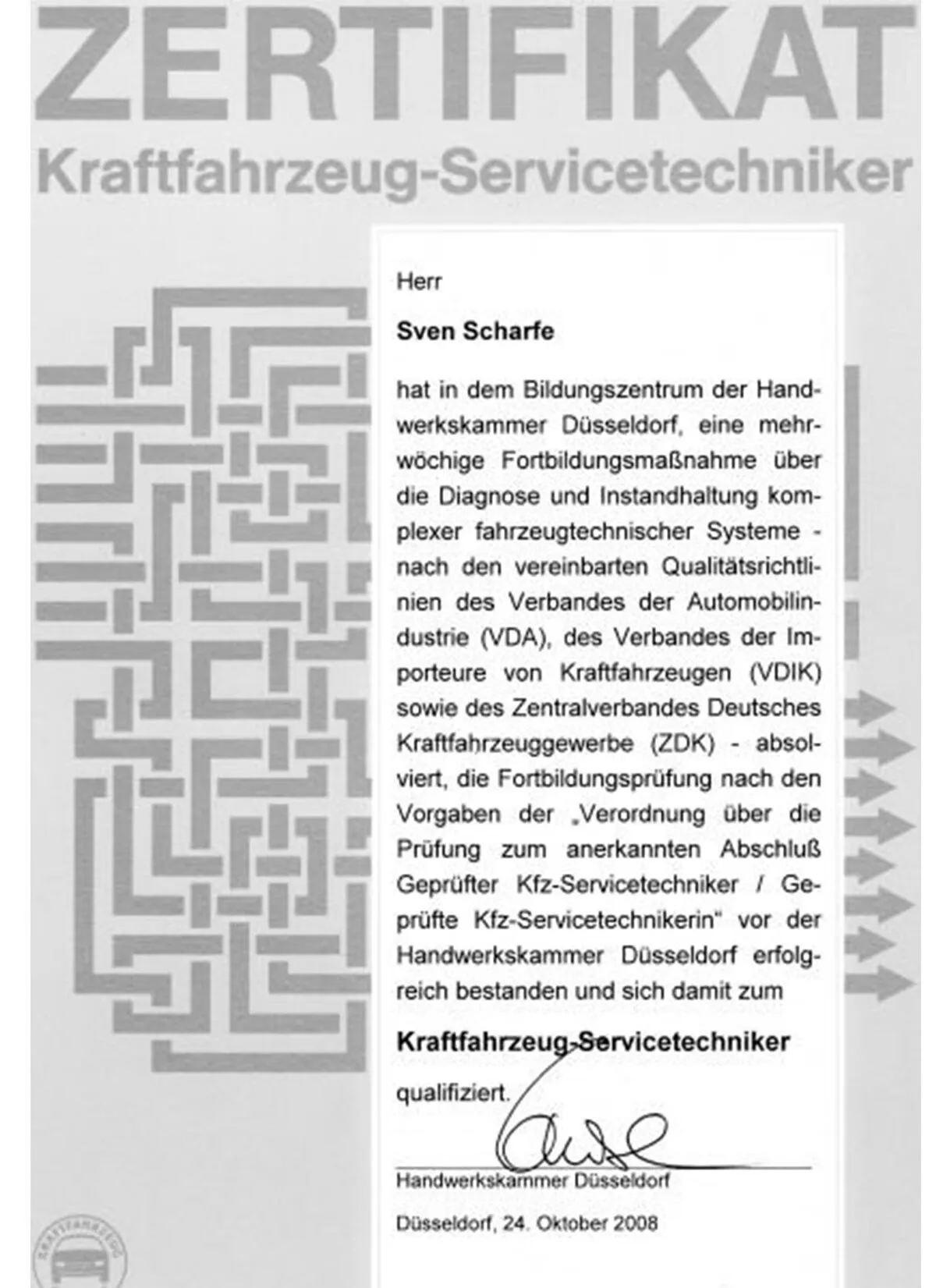 Mein Name ist Sven Scharfe und ich bin seit 15 Jahren KFZ-Gutachter mit Leib und Seele im Ruhrgebiet. Als öffentlich bestellter und vereidigter Sachverständiger von der Handwerkskammer Düsseldorf für das Kraftfahrzeugtechnikerhandwerk habe ich mit meinem neunköpfigen Team bereits mehr als 18.000 Kunden an unseren drei Standorten erfolgreich betreut. Ich verspreche Ihnen nicht nur allerhöchste Fachkompetenz, sondern auch einen TOP-Kundenservice sowie eine schnelle Bearbeitung Ihres Gutachtens.